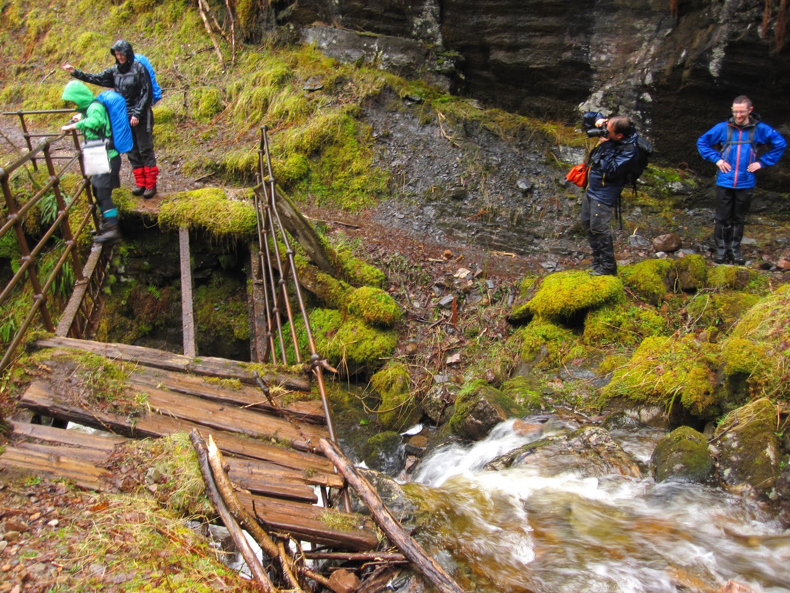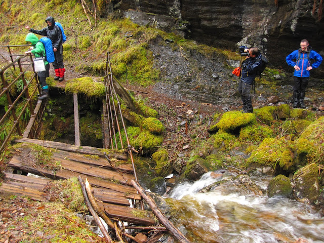 Walking out of Kinlochleven I get us lost right away, but not for long. We follow Glen Leven on a wet path in light rain alongside the river Leven, and we see huge pipes on the other side of the glen coming down the hill to Kinlochleven, and waterfall after waterfall. We stop by the most beautiful waterfall of them all for a rainy lunch. A few streams need to be crossed - usually not a problem, but on a watery day like today at least one of us loses her boots. For some reason the moods are high, and we find ourselves singing, jumping between earworms, catchy songs about rain, umbrellas, boots, bridges. We cross a very dodgy foot bridge.