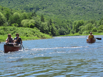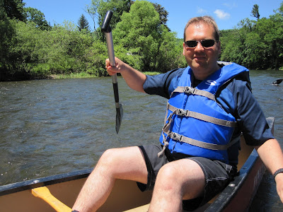 Das hatte stellenweise schon ein bisschen mehr Schwung als die Oker oder der Delaware Raritan Canal, zumal der Wasserpegel auch recht niedrig war und wir mehr als einmal ein wenig auf den Stromschnellchen entlang schrappten. Die Kanuverleiher hatten uns angeraten, nur oberhalb des eigentlichen Gorge zu paddeln, da es stromabwärts doch erfahrenere Kanuten erfordert, um durch die wilden Wasser zu navigieren. Und während Daniel noch die Geschichte seiner letzten Bootsfahrt erzählte, bei der neben ihm ein gigantischer Eisberg zerbrach (Seemannsgarn?), stellte ich fest, dass ich die Karte vergessen hatte. Nun hatten Daniel und ich zum Glück vorher einmal draufgeschaut, so dass wir in etwa wussten, in welchem Flussarm wir einbiegen, und in welchen Kurven wir uns rechts oder links halten sollten. Auch wenn das nicht immer allen gelang, erreichten alle sicher die Anlegestelle - sie zu verpassen, hätte den Trip deutlich verlängert und wäre im eigentlichen Canyon wohl recht spannend geworden. Aber alles ist gut gegangen, es gab Lunch,