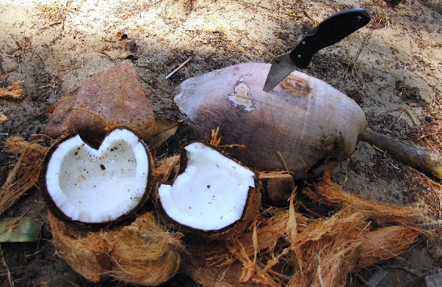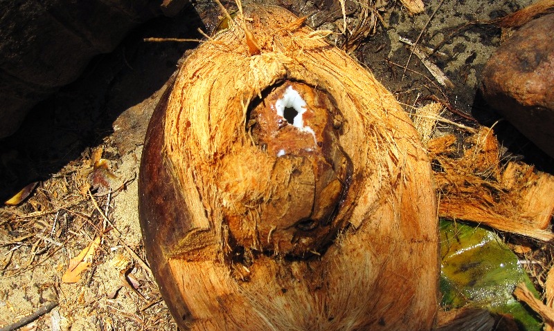 I take a dip in the sea, eat my last apple, and set off to find drinking water. I see a coconut on the ground which looks as if it hasn’t been there for very long. I carefully approach it while watching the other, dangerous ones on the tree. It takes me about an hour to open it with my cheap knife and a rock.