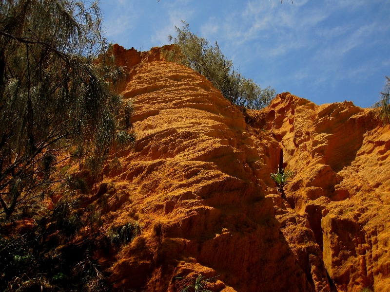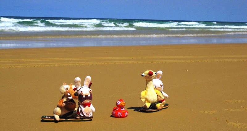 Anyway, Fraser Island is pretty, would be even prettier if it wasn’t full of tourists. We saw a wild dingo munching away at a whale carcass, that then one night (the dingo, not the whale’s ghost) ripped open one lady’s tent who against better knowledge had stored food (cereal bars) in a bag in the tent. The dingo took the bag and distributed the contents in the area, but they could be recovered for the most part the next morning.