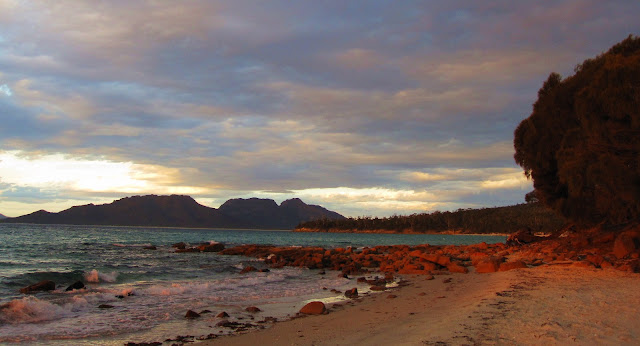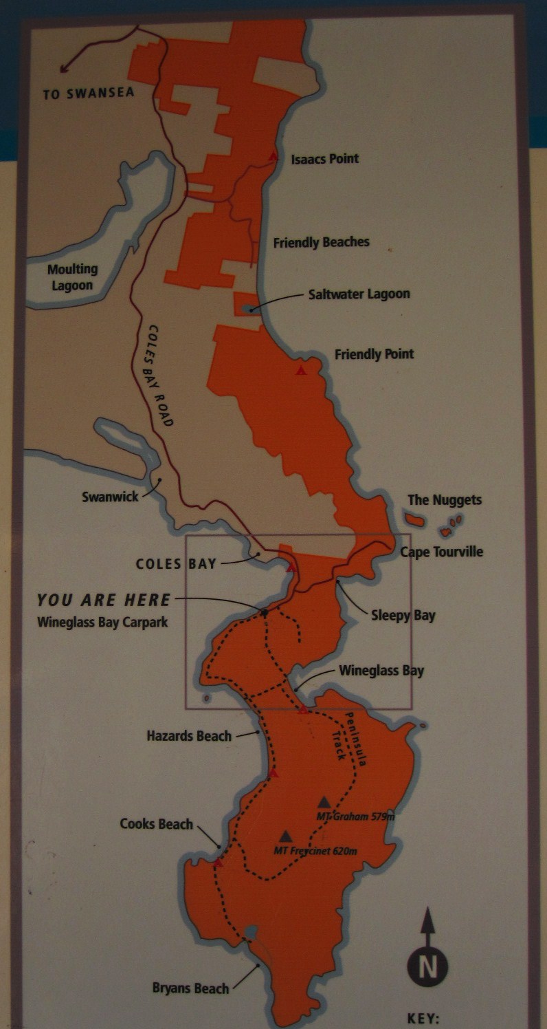 Freycinet peninsular. I walked from the car park via Hazards Beach to Cooks Beach, from there via Mt. Graham to Wineglass Bay and back to the car park.
