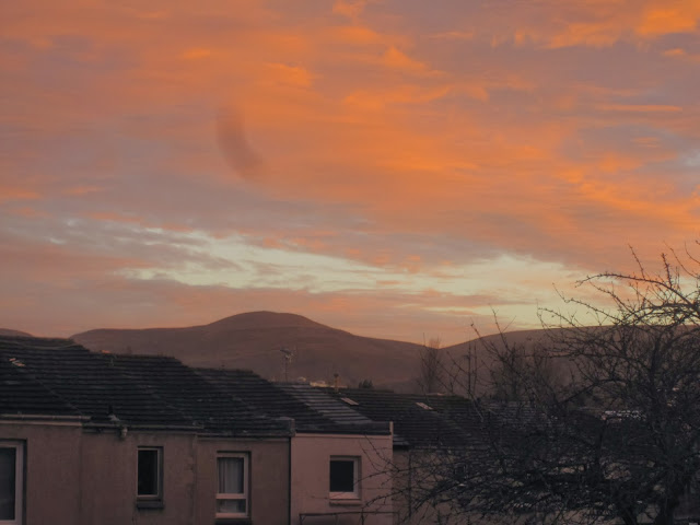 View from my Flat 2013 Nov 30 - scotland And here’s the view from my flat during the great sunset on Thanksgiving last week. This is Allermuir Hill in the Pentlands. If you look closely you can see Arthur’s Seat in the centre and a fuzzy castle in the bottom left corner of the picture.