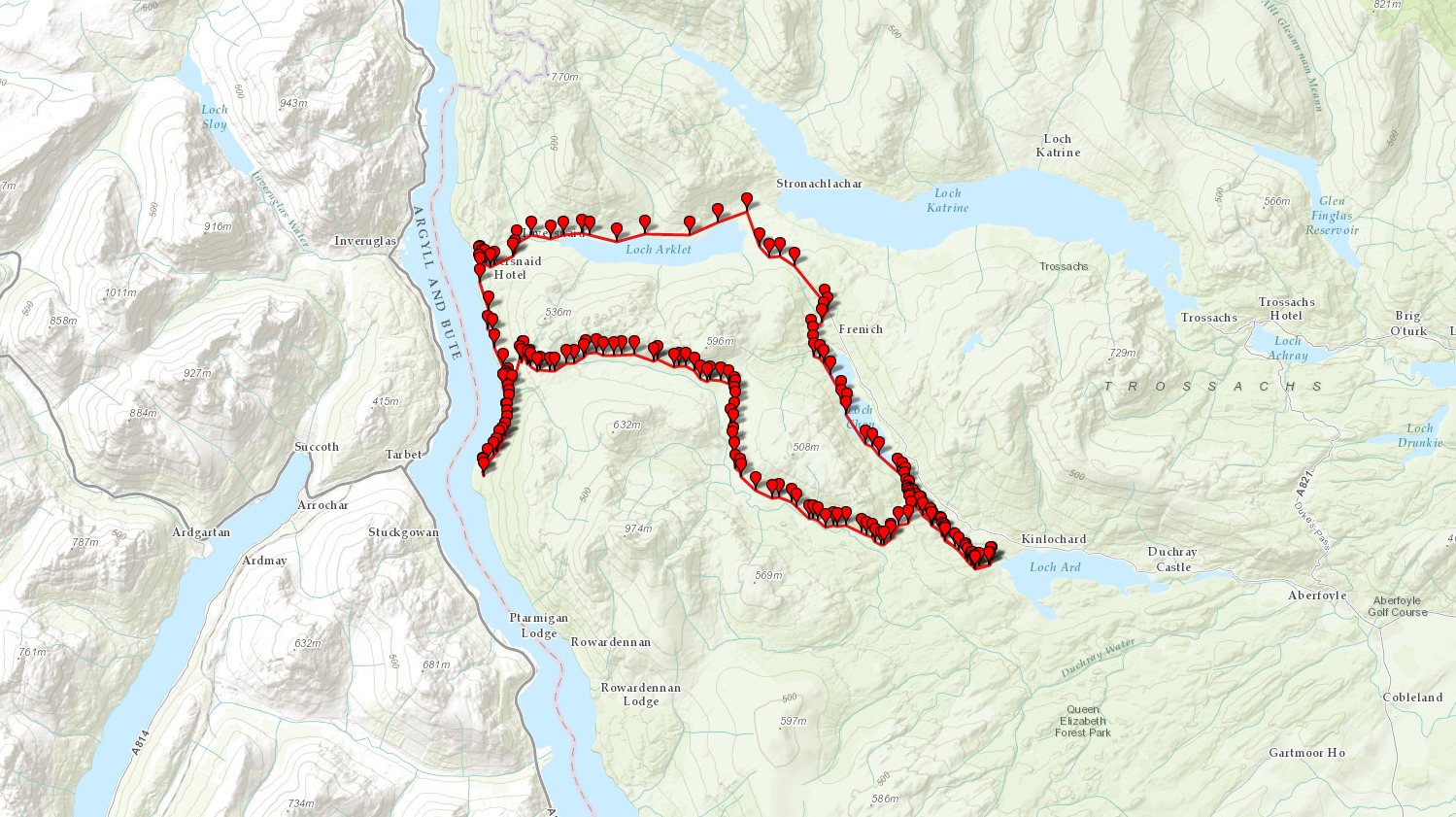 Starting at the bottom right corner we walked clockwise to Loch Lomond and back, 40 km in total.