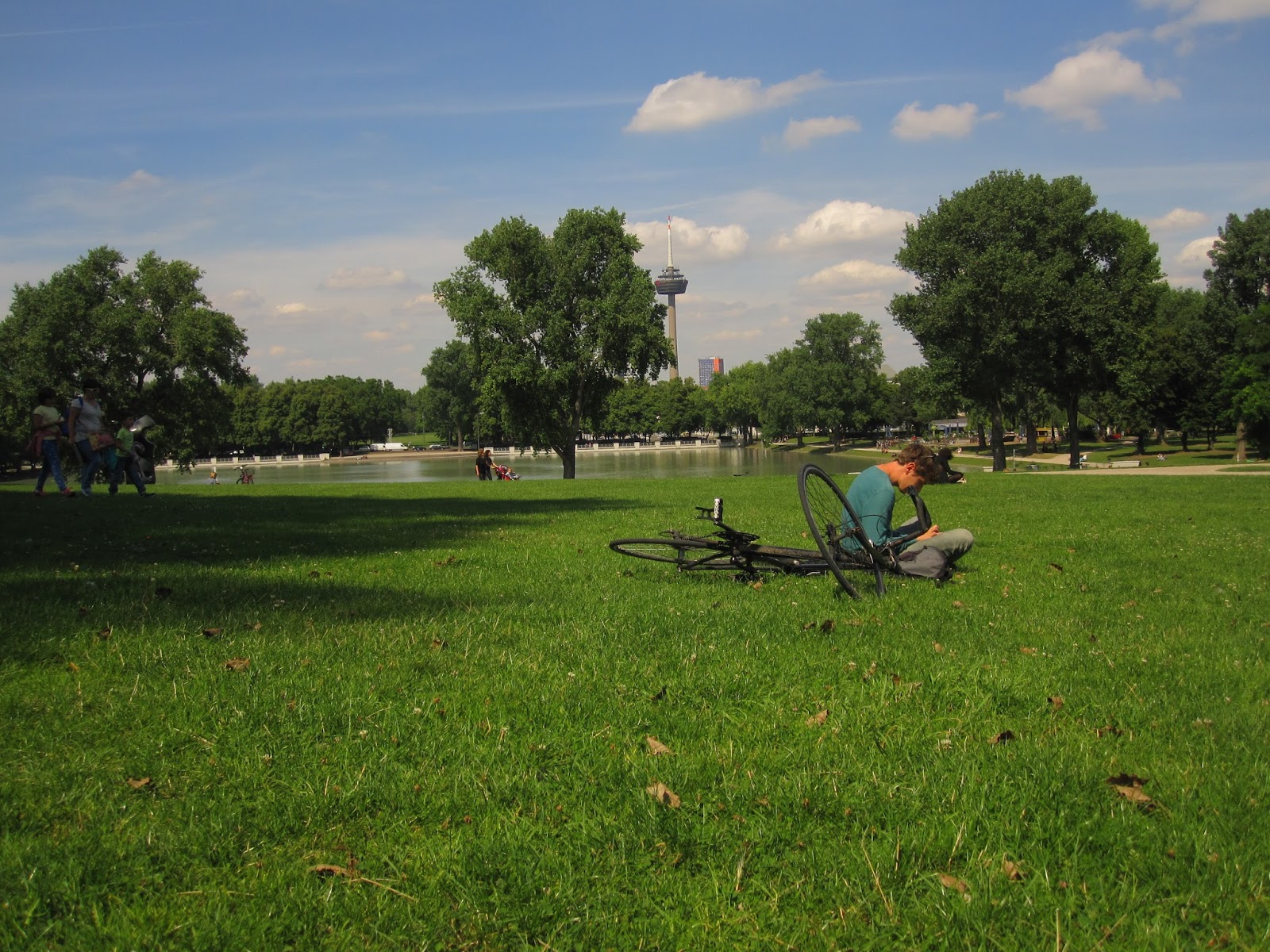 | Park near Aachener Weiher, pretty boy, and Rundfunkturm in the background. |