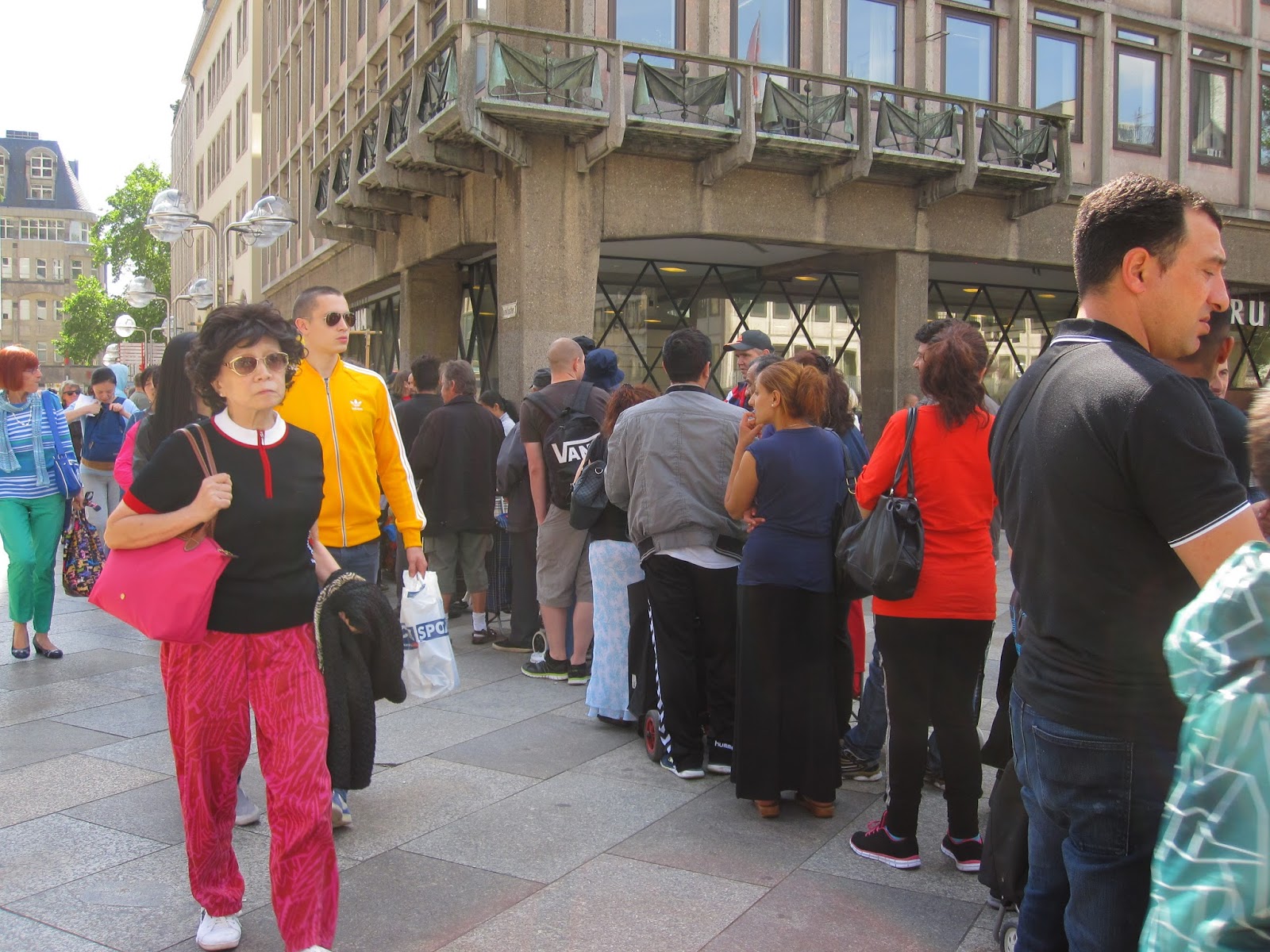 | Queue for the soup kitchen next to the Dom. Tourists wondering what people are queuing for. |