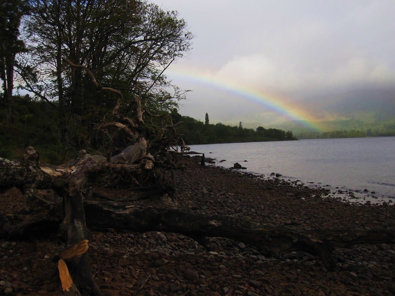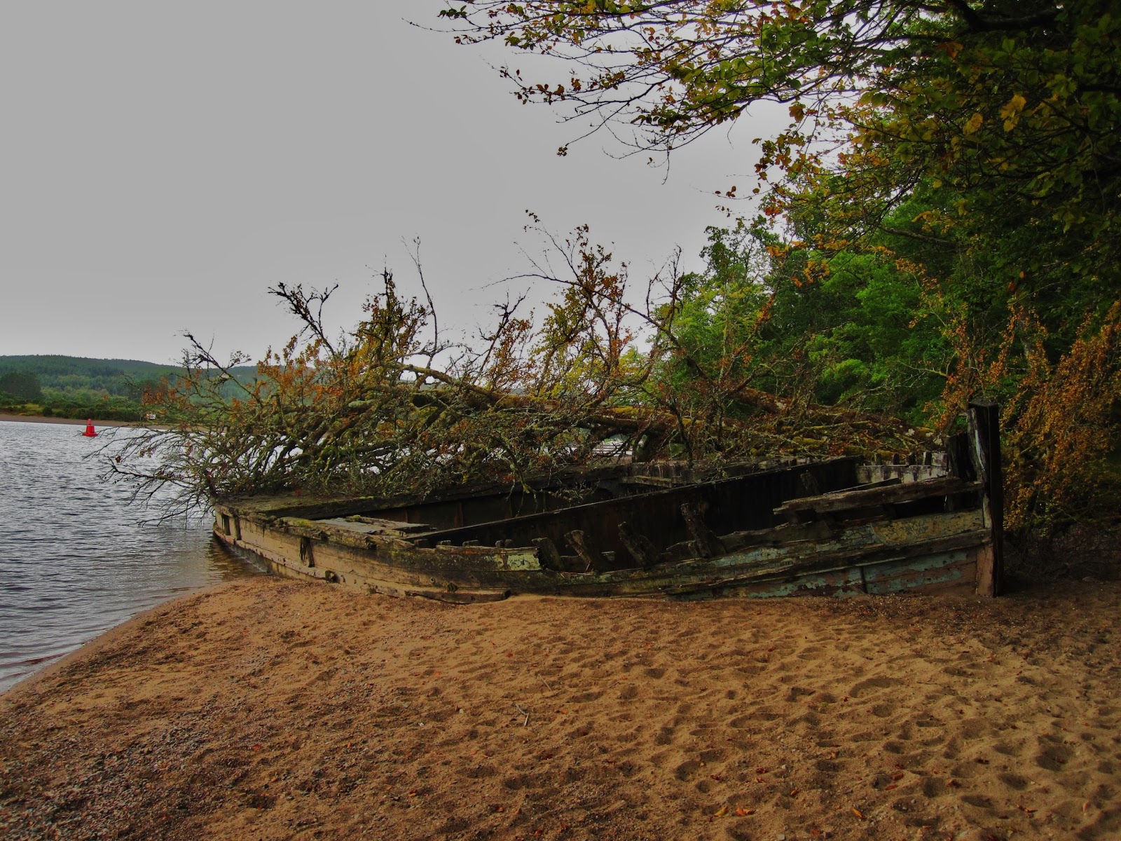 We walk on more tarmac for a while and I briefly regret our decision not to go by car any further. But soon after, we leave the road and reach a lovely and quite eerie stretch along Loch Lochy. There are loads of mature trees with lichen beards, hidden beaches, an old shipwreck, although no sign of Lizzie, Loch Lochy’s monster.