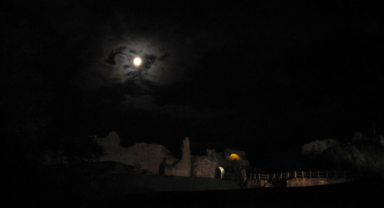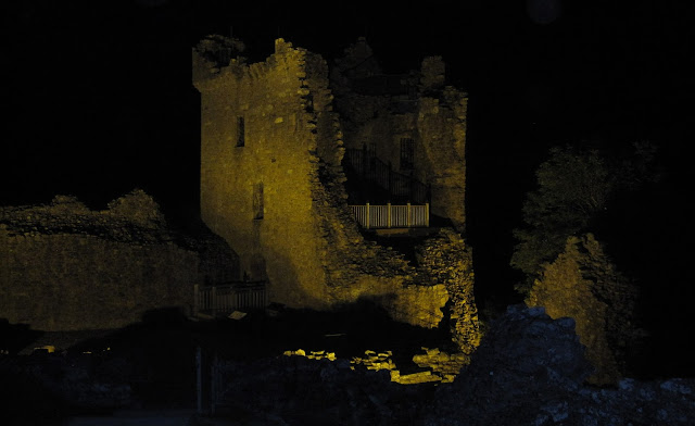 It is dark but there is an almost full moon lighting our way to the loch. One mile he said. It feels like more than that. We’re walking on a narrow cycle path and almost get run over by a cyclist with no lights. The castle sits on a little headland besides Loch Ness. It is illuminated now and there are no people or cars anywhere. We open the gate and walk through as instructed by the hostel warden.