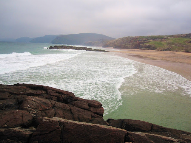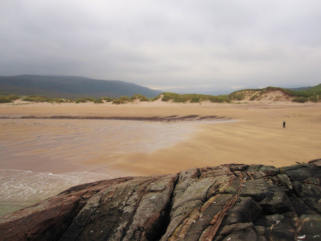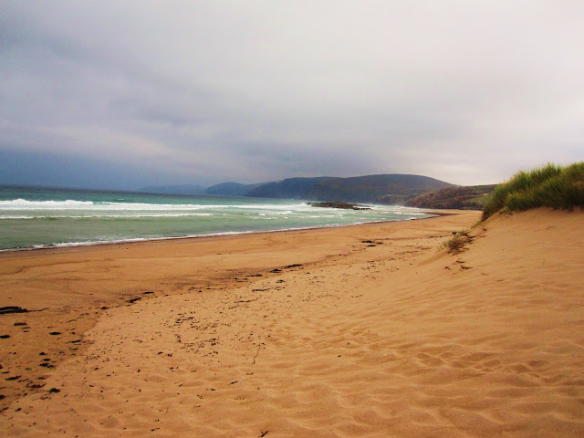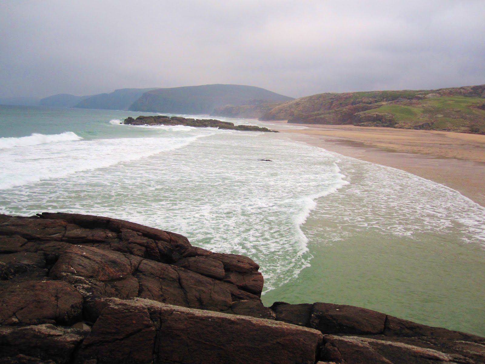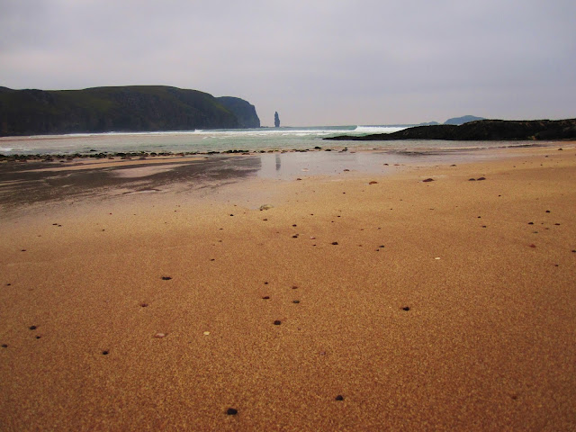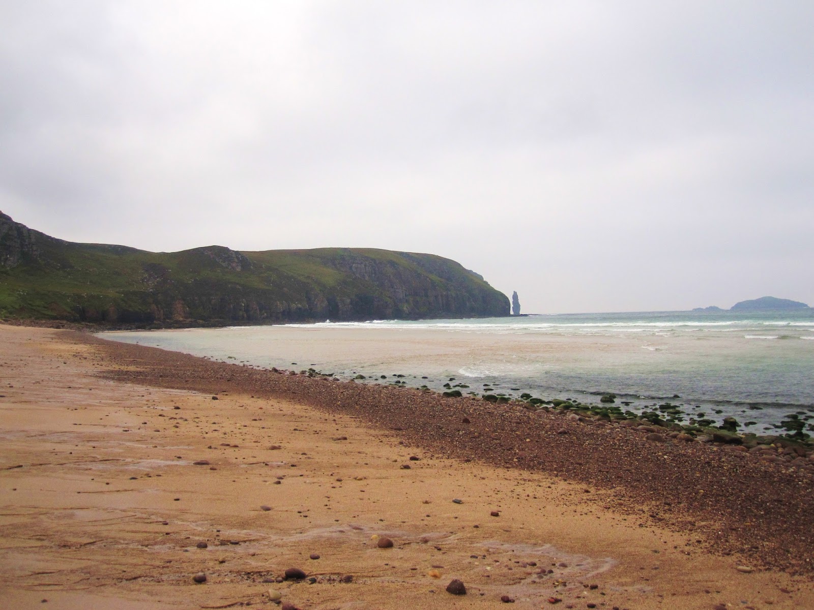He’s staying for another half hour while we’re itching to go to Sandwood Bay, allegedly Britain’s most beautiful beach and only to be reached by boat or on foot. We reach the parking lot somewhere between Oldshoremore and Sheigra quite late in the morning, and it is a beautiful, sunny day. It is still sunny on the four-mile walk, but just when we get to the bay a dark wall of clouds descends on us.