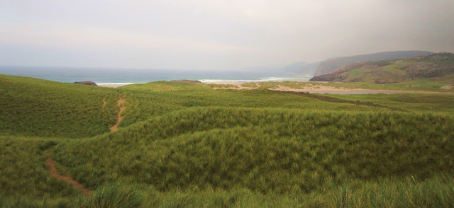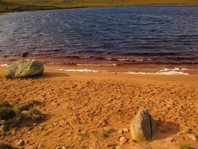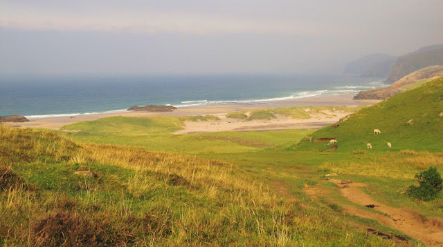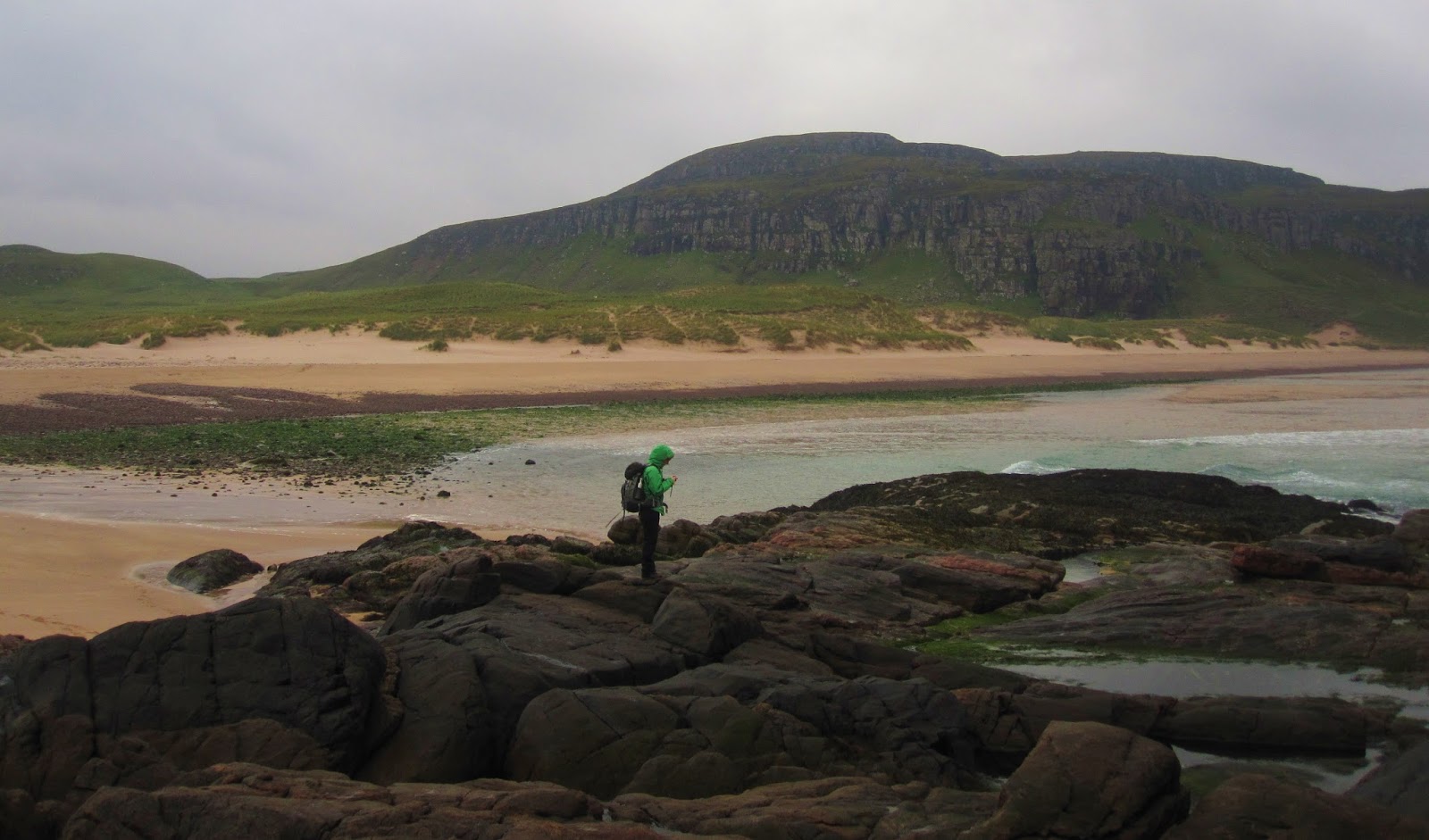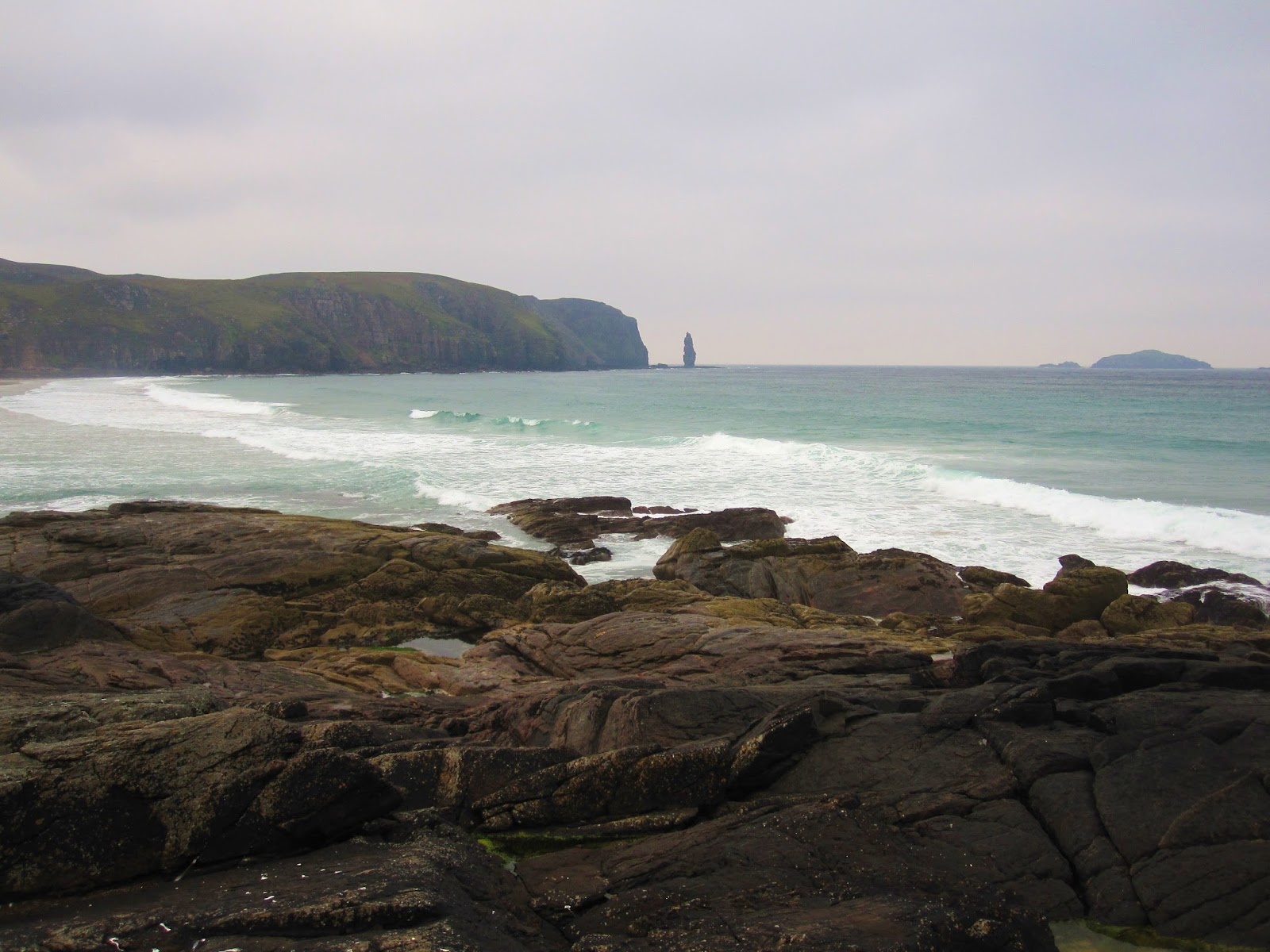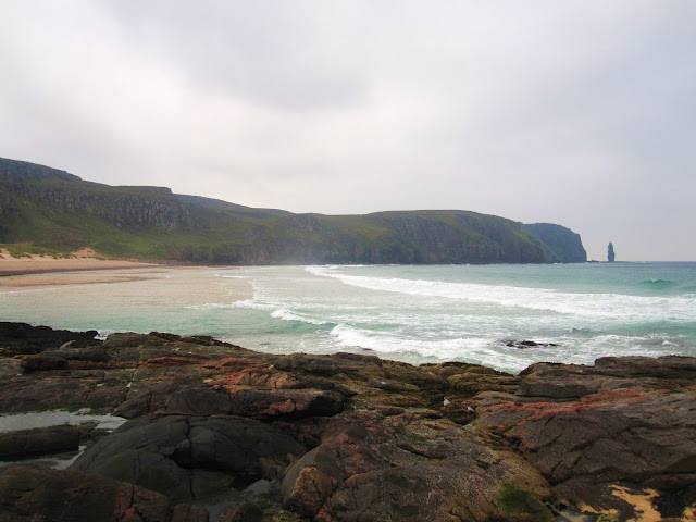 He’s staying for another half hour while we’re itching to go to Sandwood Bay, allegedly Britain’s most beautiful beach and only to be reached by boat or on foot. We reach the parking lot somewhere between Oldshoremore and Sheigra quite late in the morning, and it is a beautiful, sunny day. It is still sunny on the four-mile walk, but just when we get to the bay a dark wall of clouds descends on us.