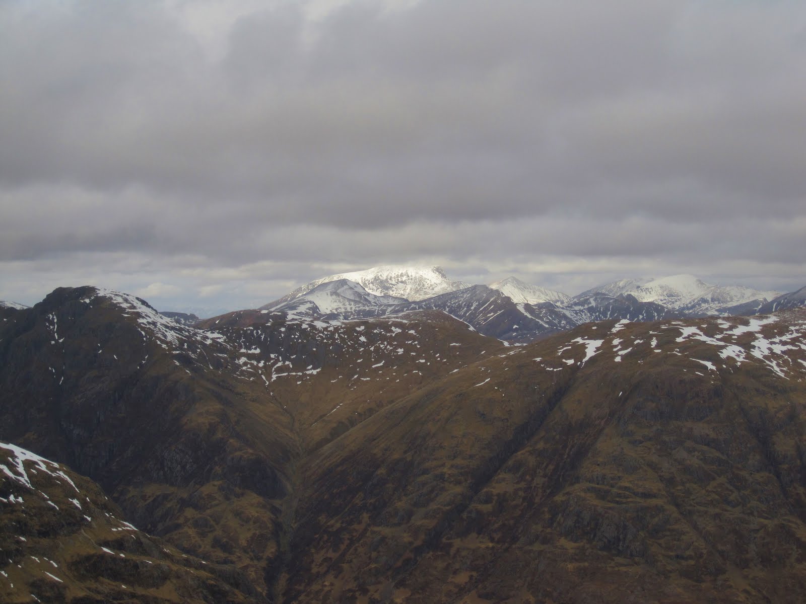 When no one gets blown off the ridge or the top we slide down the snowy slope on our bums, back to the bealach. There is really no reason to walk down a hill when you can slide it down on your bum. Especially when you have an audience. We climb the other top - the wind is getting stronger and helping us up. I have a vision of the first of our group arriving at the top and, caught by a gale, flying over it. This doesn’t happen. We take a quick break to enjoy the views of Ben Nevis in a cloud, the Blackwater reservoir, glacial features everywhere, and hills and snow. Walking down again I get a premonition of the muscle pain to come.