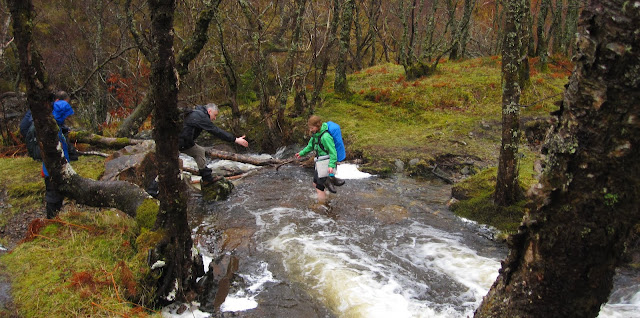 Walking out of Kinlochleven I get us lost right away, but not for long. We follow Glen Leven on a wet path in light rain alongside the river Leven, and we see huge pipes on the other side of the glen coming down the hill to Kinlochleven, and waterfall after waterfall. We stop by the most beautiful waterfall of them all for a rainy lunch. A few streams need to be crossed - usually not a problem, but on a watery day like today at least one of us loses her boots. For some reason the moods are high, and we find ourselves singing, jumping between earworms, catchy songs about rain, umbrellas, boots, bridges. We cross a very dodgy foot bridge.