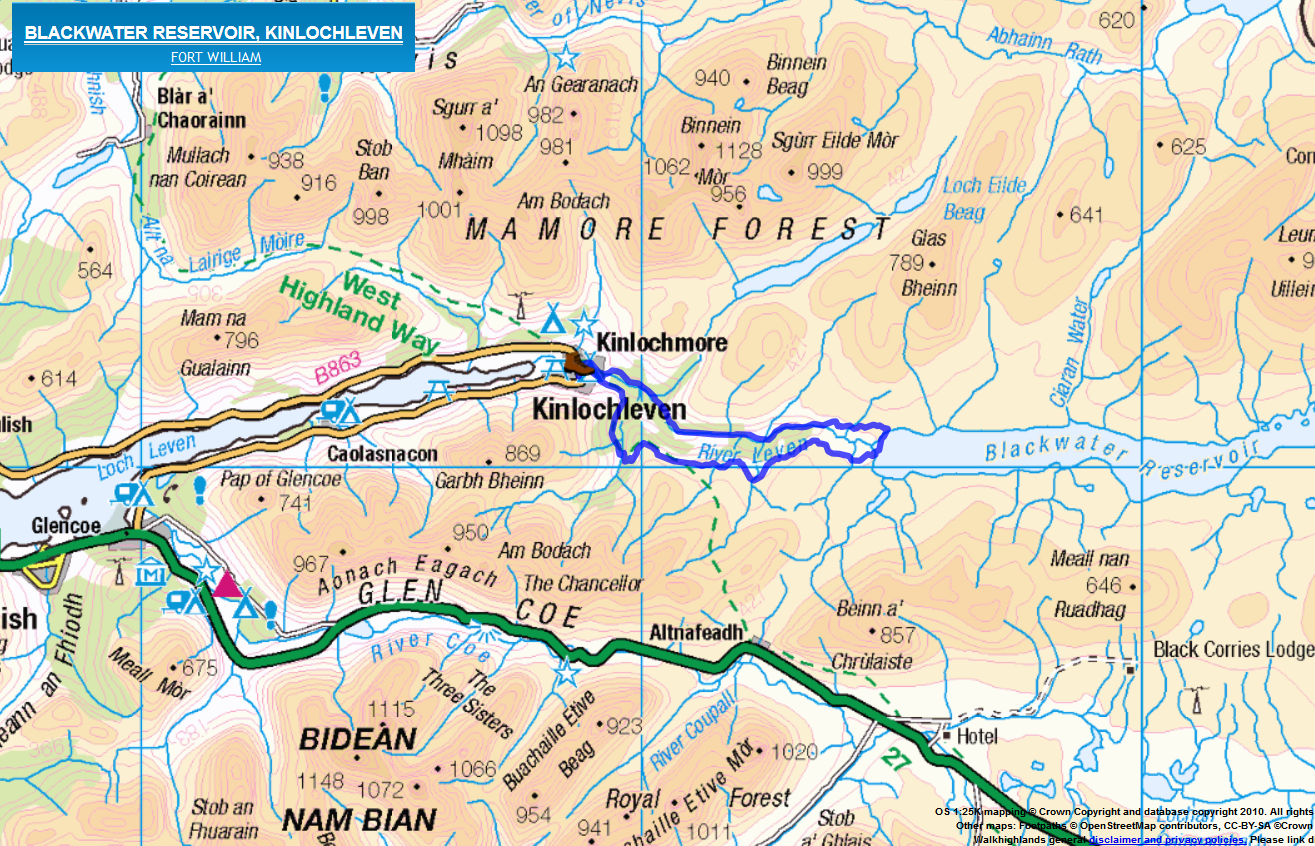 | Today’s wet walk. Also Buachaille Etive Beag at the bottom, and our cottage in Glencoe (red triangle) |