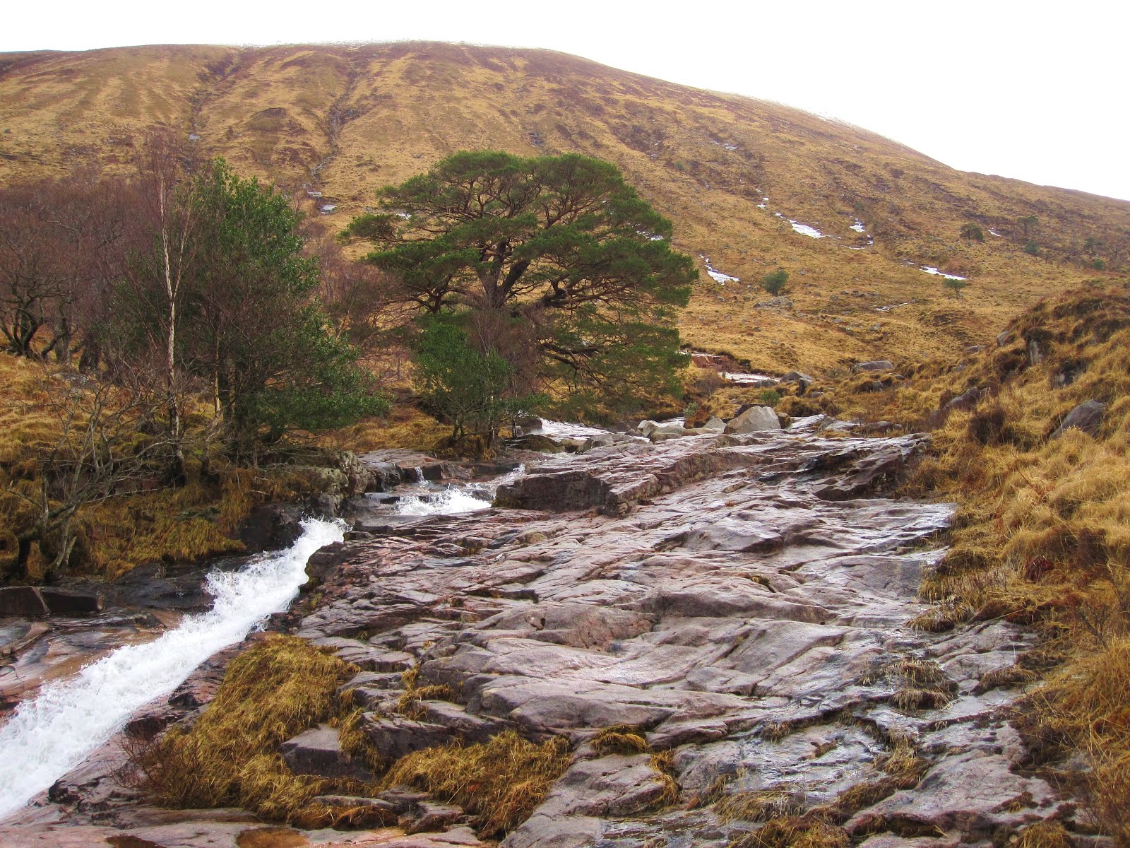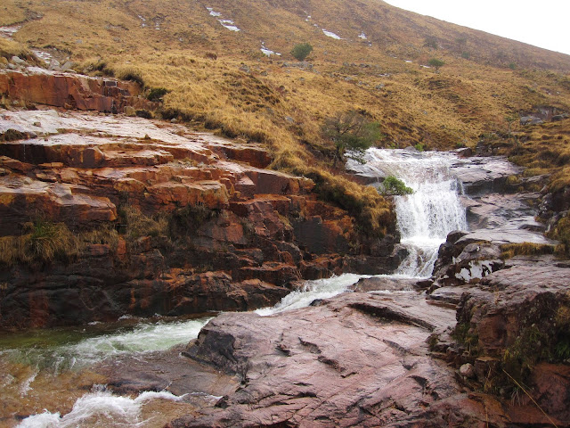 We follow the river which goes all the way up to the bealach we are aiming for. There are again great waterfalls and water slides on granite slabs - it looks like the water is having a lot of fun coming down here! The sun comes out occasionally, but my lack of motivation has spread and we decide we might not do the whole climb but just walk up the river for a bit longer. With this decision I’m suddenly much happier!