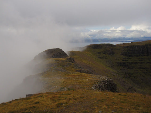 To my left, I can see the next ridge with almost vertical slopes. To my right is clouds. I reach the end of the spur, which is the top, and have lunch. I turn back, do the scrambles again the other way, giving the bypasses a miss. The clouds lift and I see Skye.