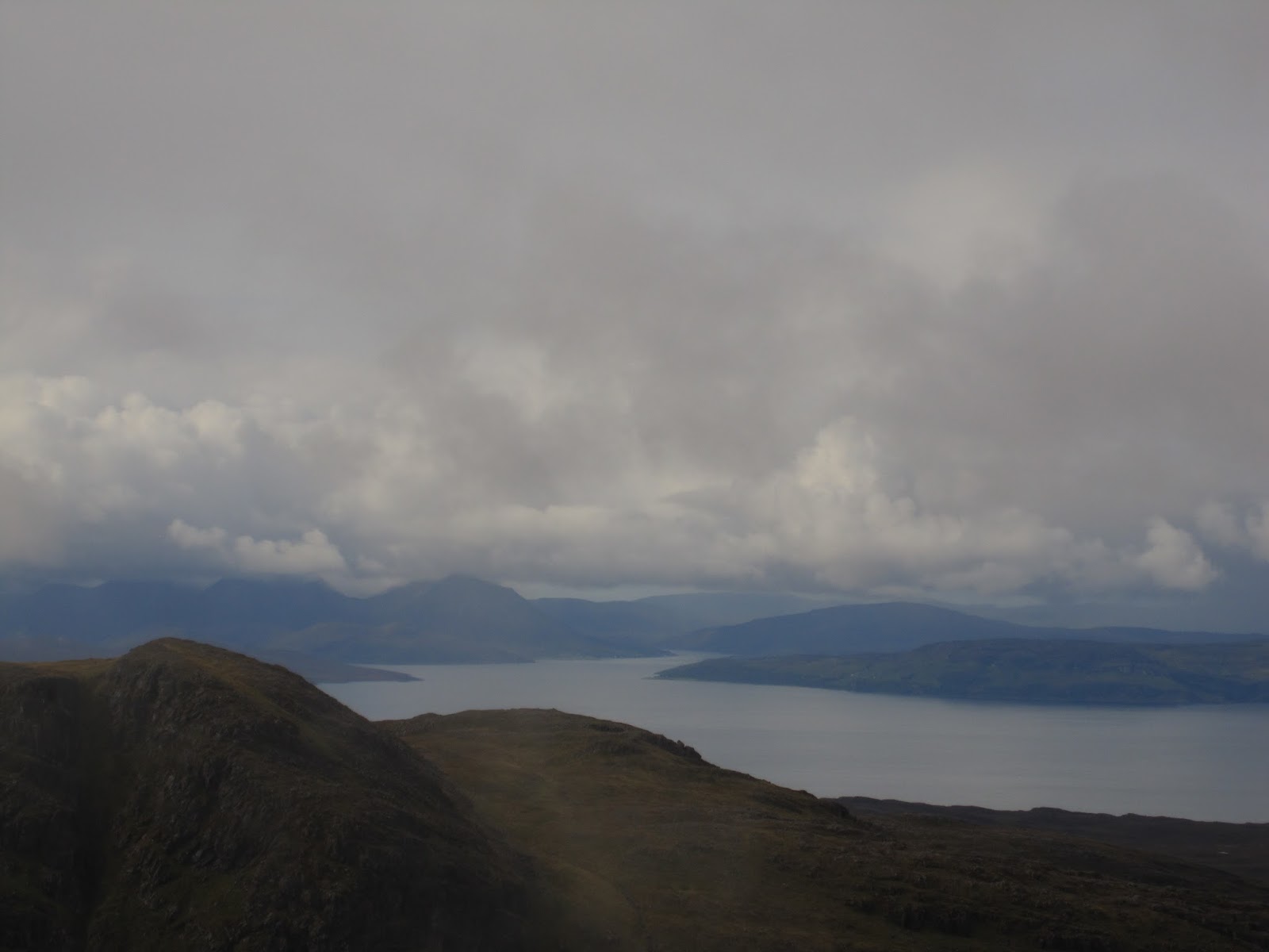 To my left, I can see the next ridge with almost vertical slopes. To my right is clouds. I reach the end of the spur, which is the top, and have lunch. I turn back, do the scrambles again the other way, giving the bypasses a miss. The clouds lift and I see Skye.