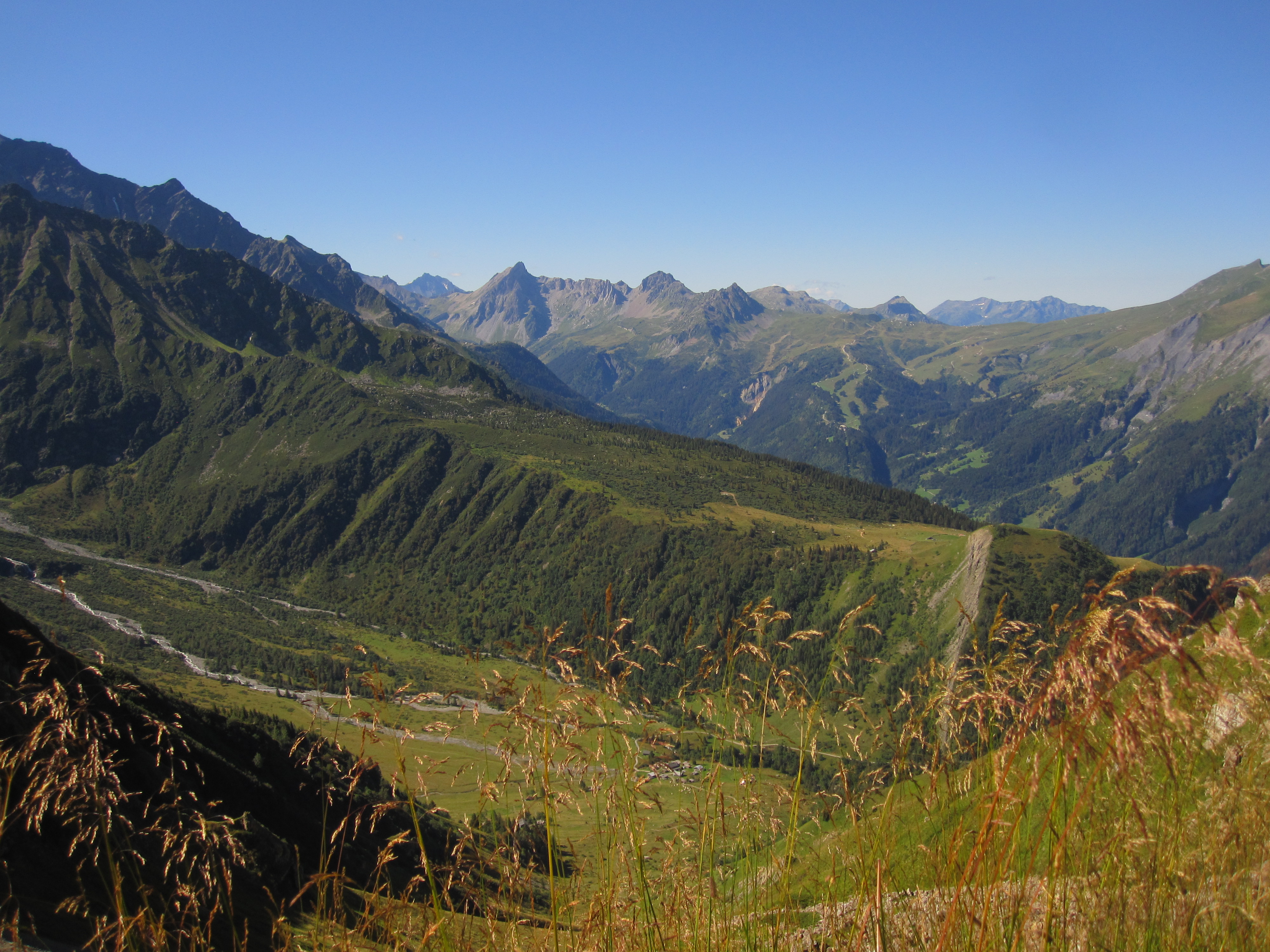 Once we’d left the cable car, and with the alpinistes off in a tram further up, we were on our own to start this day’s walk. It was nice and quiet and I had a wee on the path. We first had to cross a wobbly Himalayan-style suspension bridge across the outlet of the Bionnassay glacier. We then climbed up high to Col de Tricot at 2,120 m, our first big mountain pass. (Col Brevent on the previous day doesn’t count as it was hardly a big climb from the cable car top station.) It was sunny and hot again, but not too bad this high up. It was a steep descent down on the other side, and at the bottom, we put our feet in a stream, watching some holiday-makers who had come up for the day or were staying in chalets in the valley. Then another short climb, where apparently I was grumpy again (uphill makes me grumpy), another chalet, where we had coffee in bowls and listened to the cow bells. And after a few more long hours going downhill we arrived in the village of Les Contamines, where we refilled our water bottles from a trickly fountain which needed three of its four spouts blocked for enough water to come out of the fourth. I was tired! But Les Contamines was not to be the end of the day. No, it wasn’t, and I silently, or not so silently, cursed our travel organisers, because why the hell wasn’t Les Contamines the end of the day?