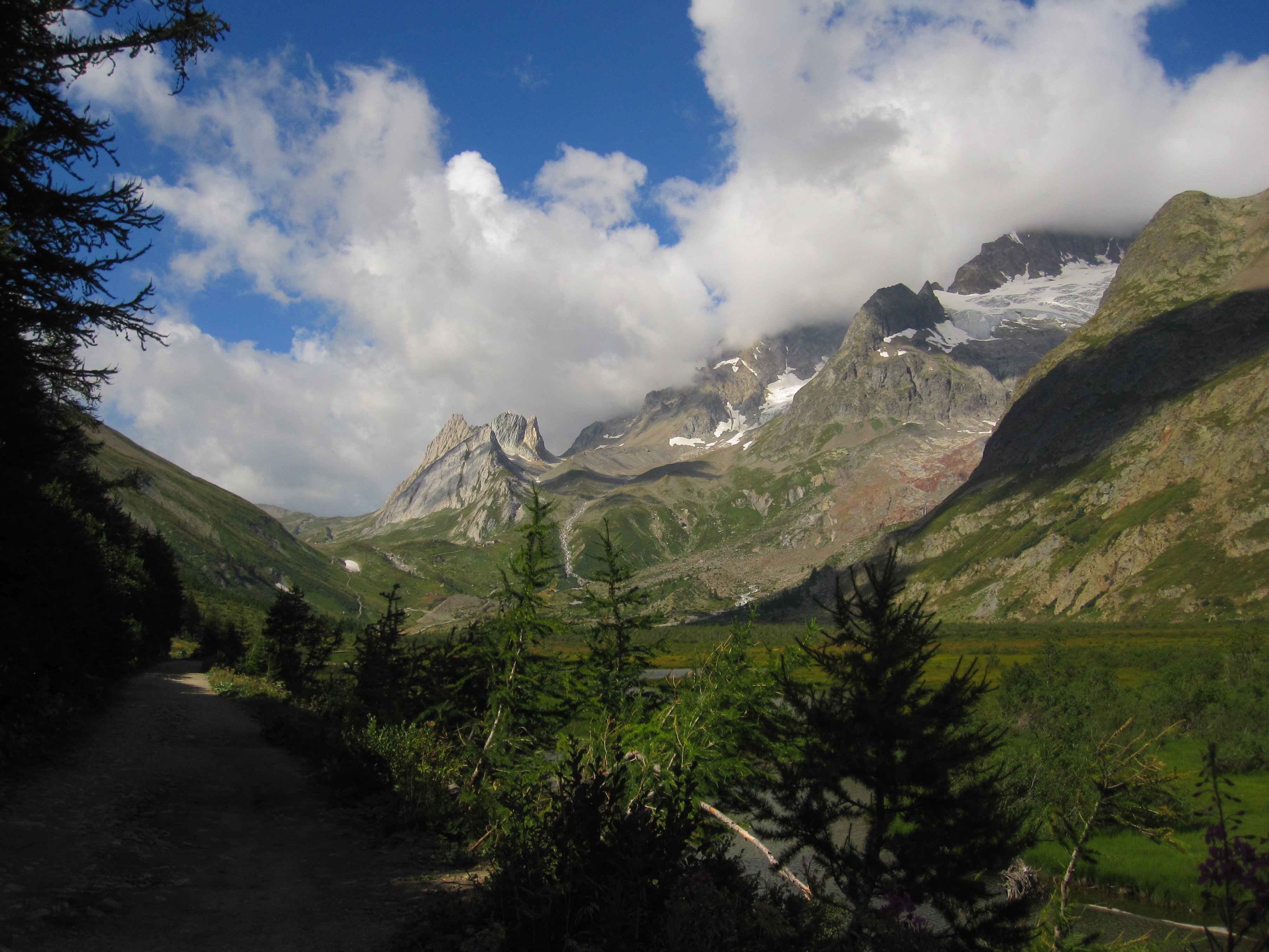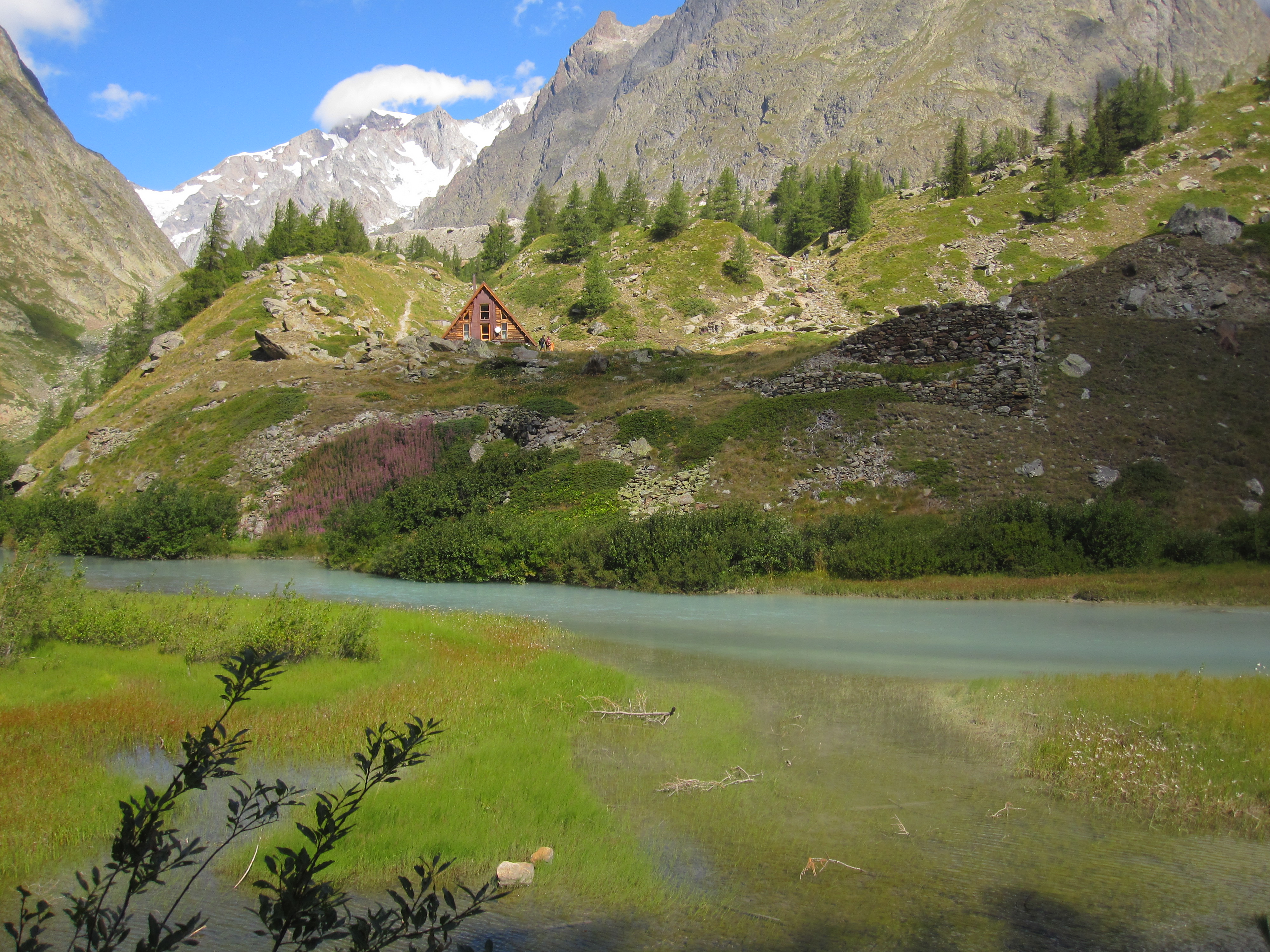 On leaving the refuge, Mr W slipped and fell on his arse. The skies had brightened a bit, and we walked down Val Veny on an old cobbled army road, with a view of the great moraine coming down from the Glacier du Miage. We now needed to climb up and over a spur once more to then walk along the side of the ridge opposite the Mont Blanc massif almost all the way to Courmayeur, and with great views of Mont Blanc, le Dent du Geants, Glacier du Miage, and Rifugio Monzino. The final miles were downhill and by now, I was in considerable pain on every other hobble. Just above Courmayeur was a large skiing complex, and most TMB walkers stopped at Maison Vieille, but we had to walk a little bit further to Le Randonneur, a huge empty dorm and restaurant with us the only guests. Dinner was pasta with tomato sauce, then some pork or beef roast with extra creamy mashed potatoes, and ice cream for afters.